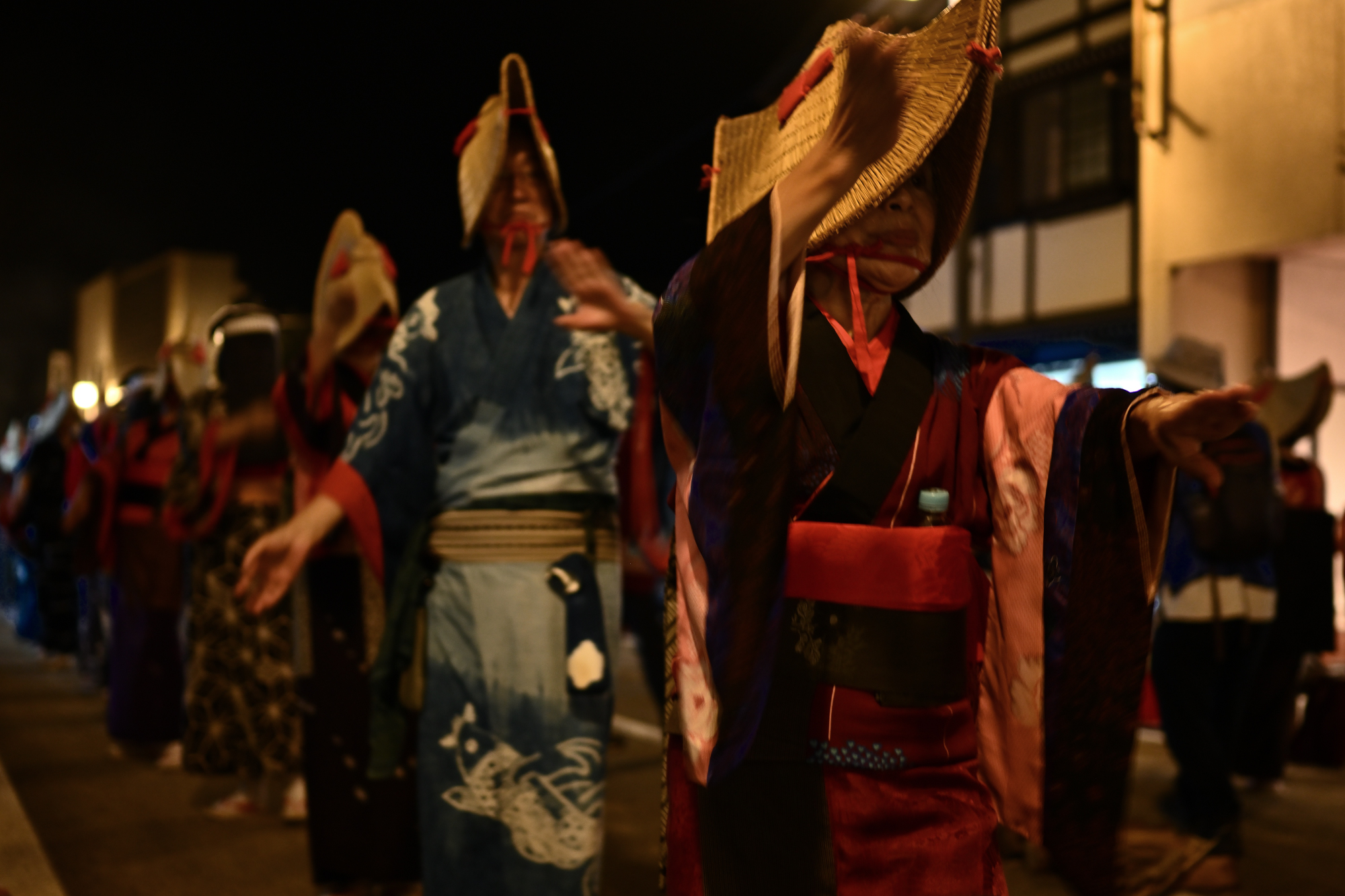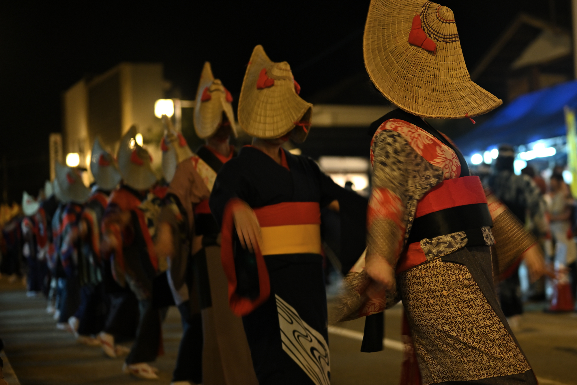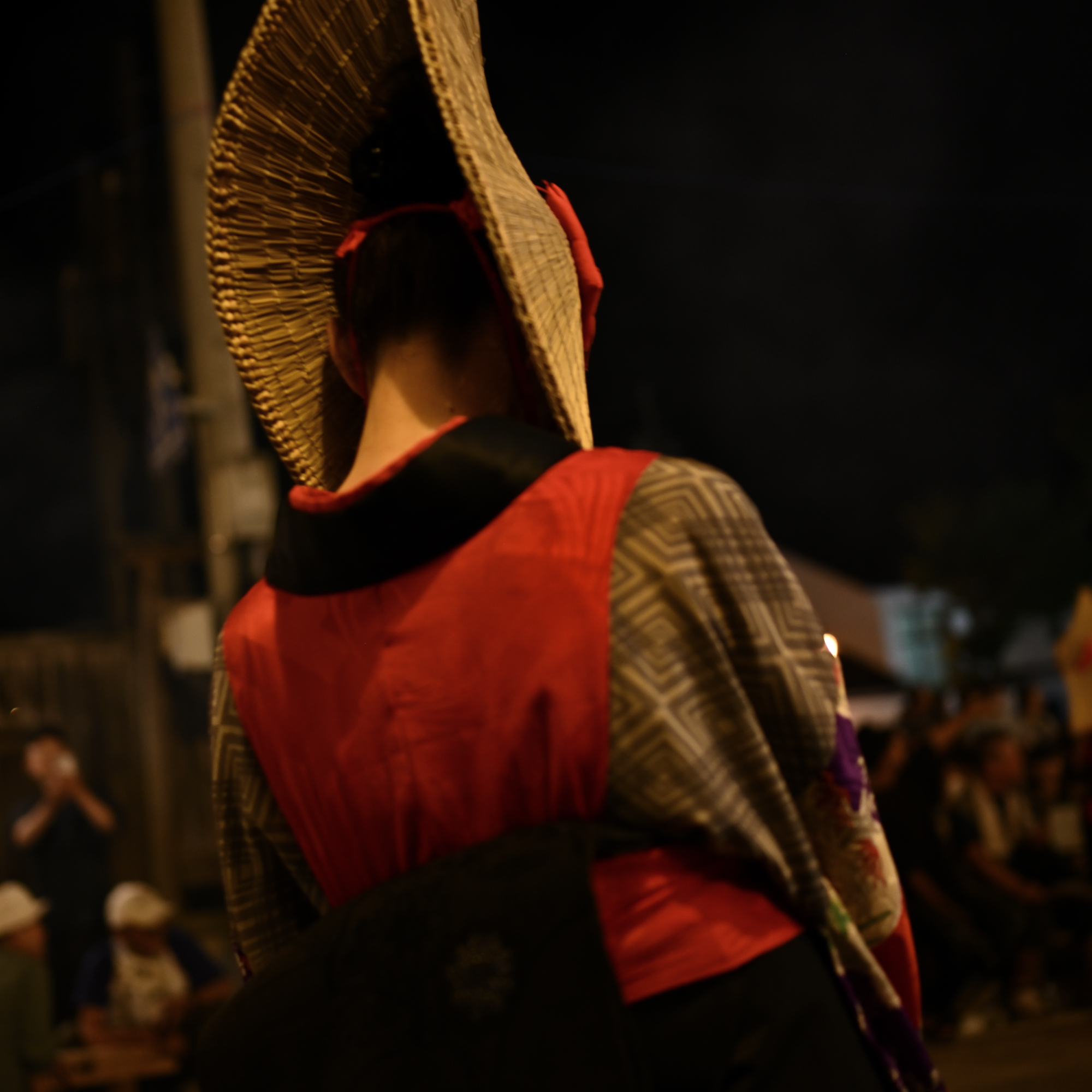 篝火に照らされて、目深に編み笠をかぶって美しい端縫い衣装をまとった踊り手たちが、盆踊り会場を舞めぐります。