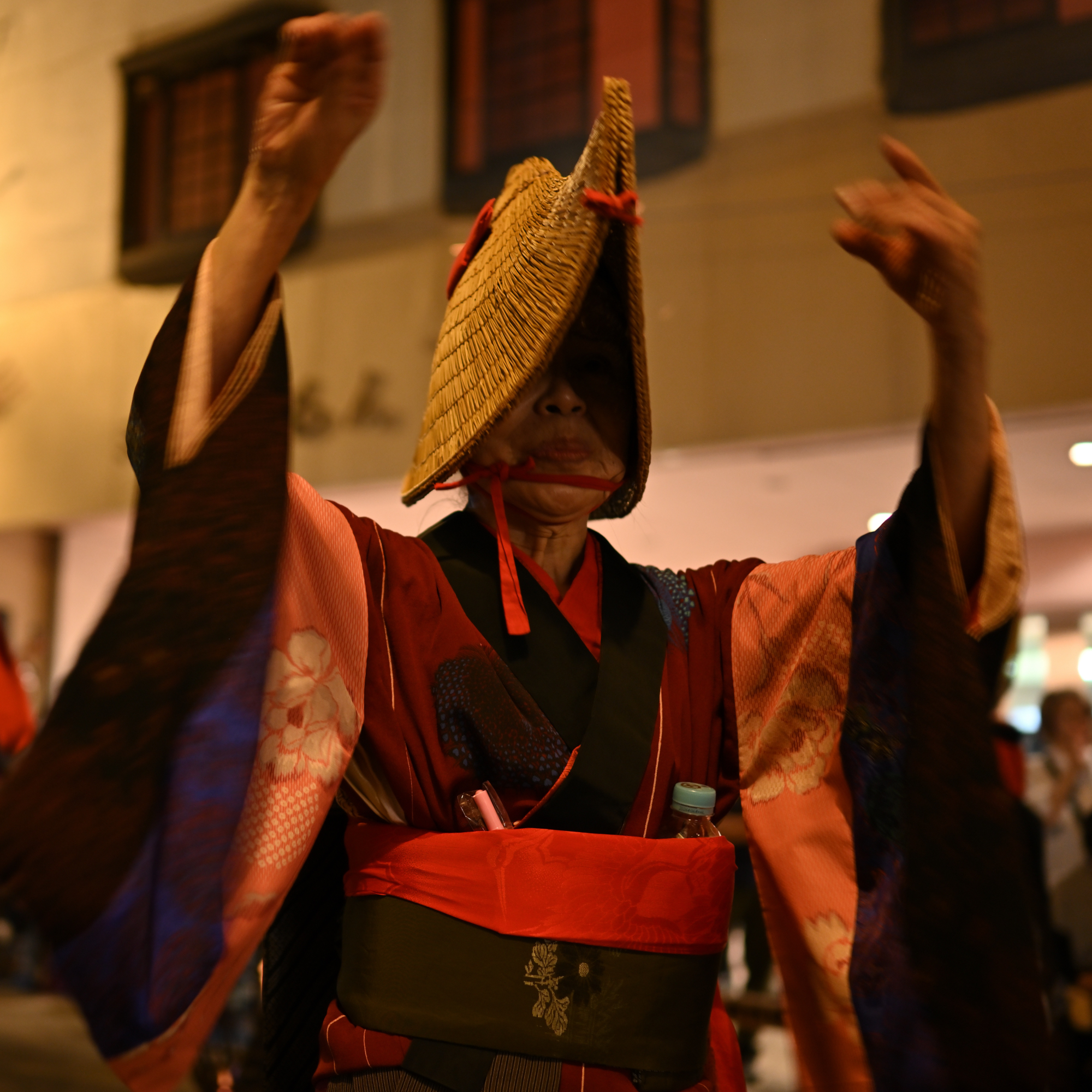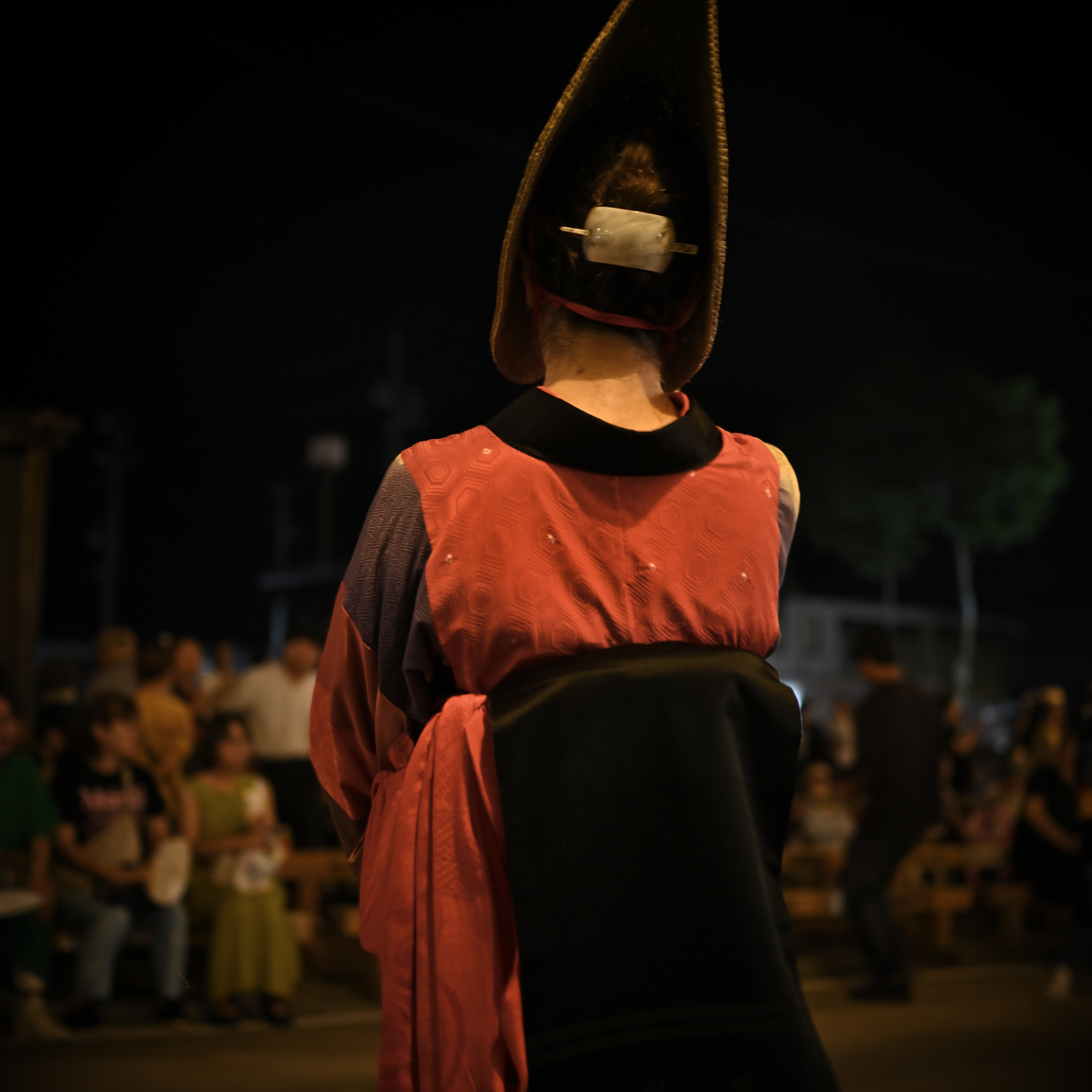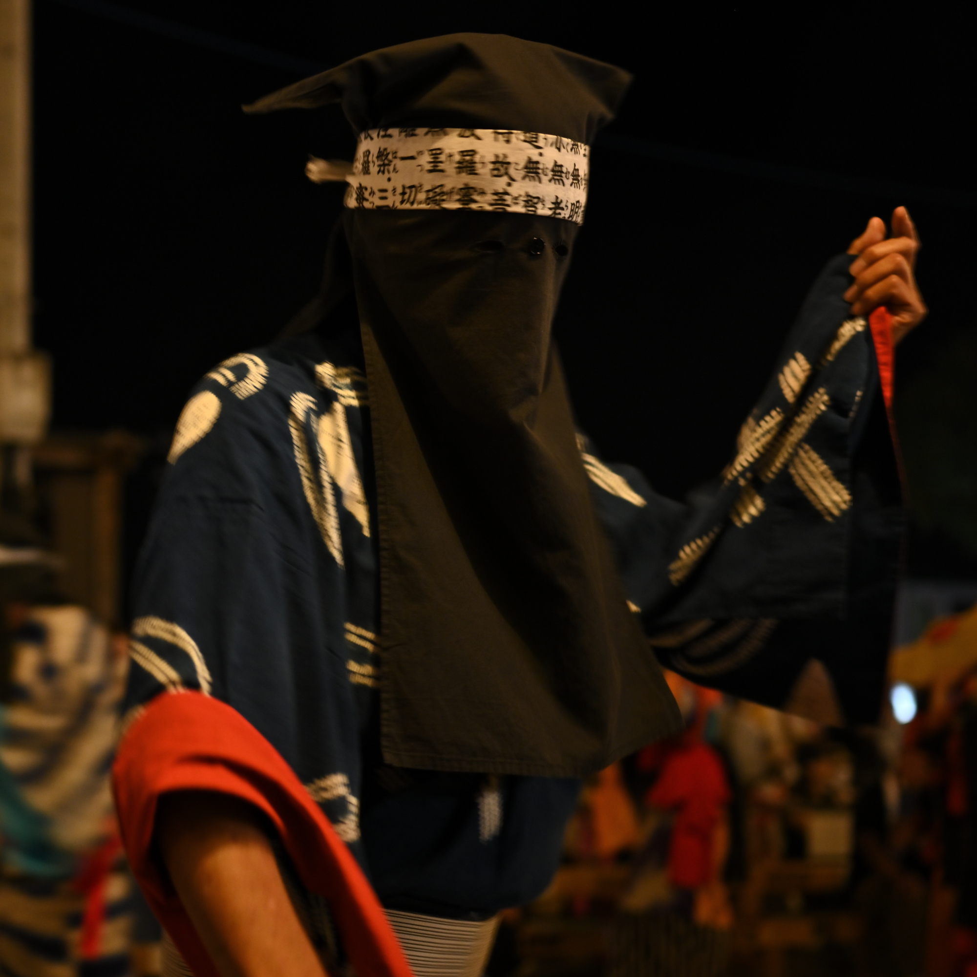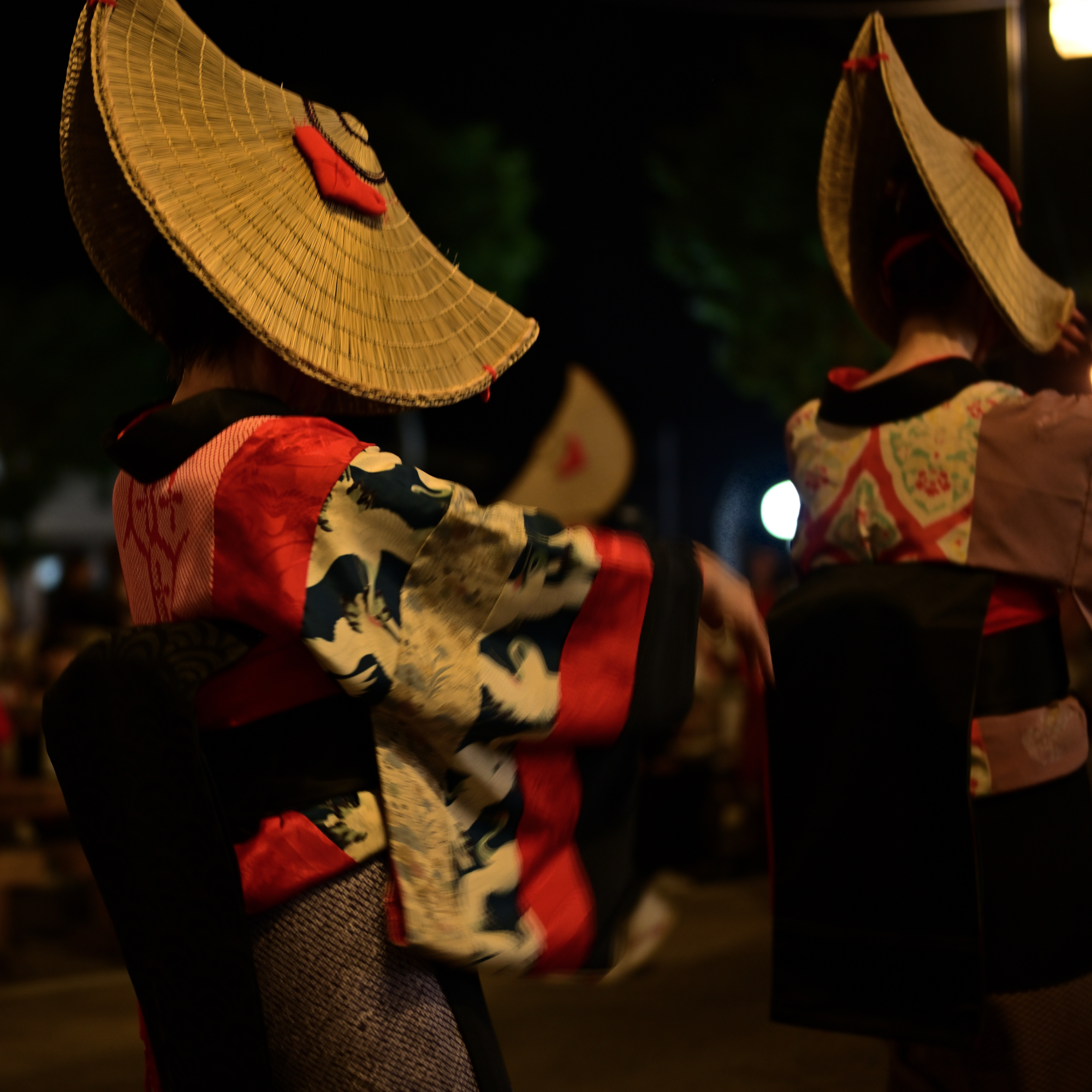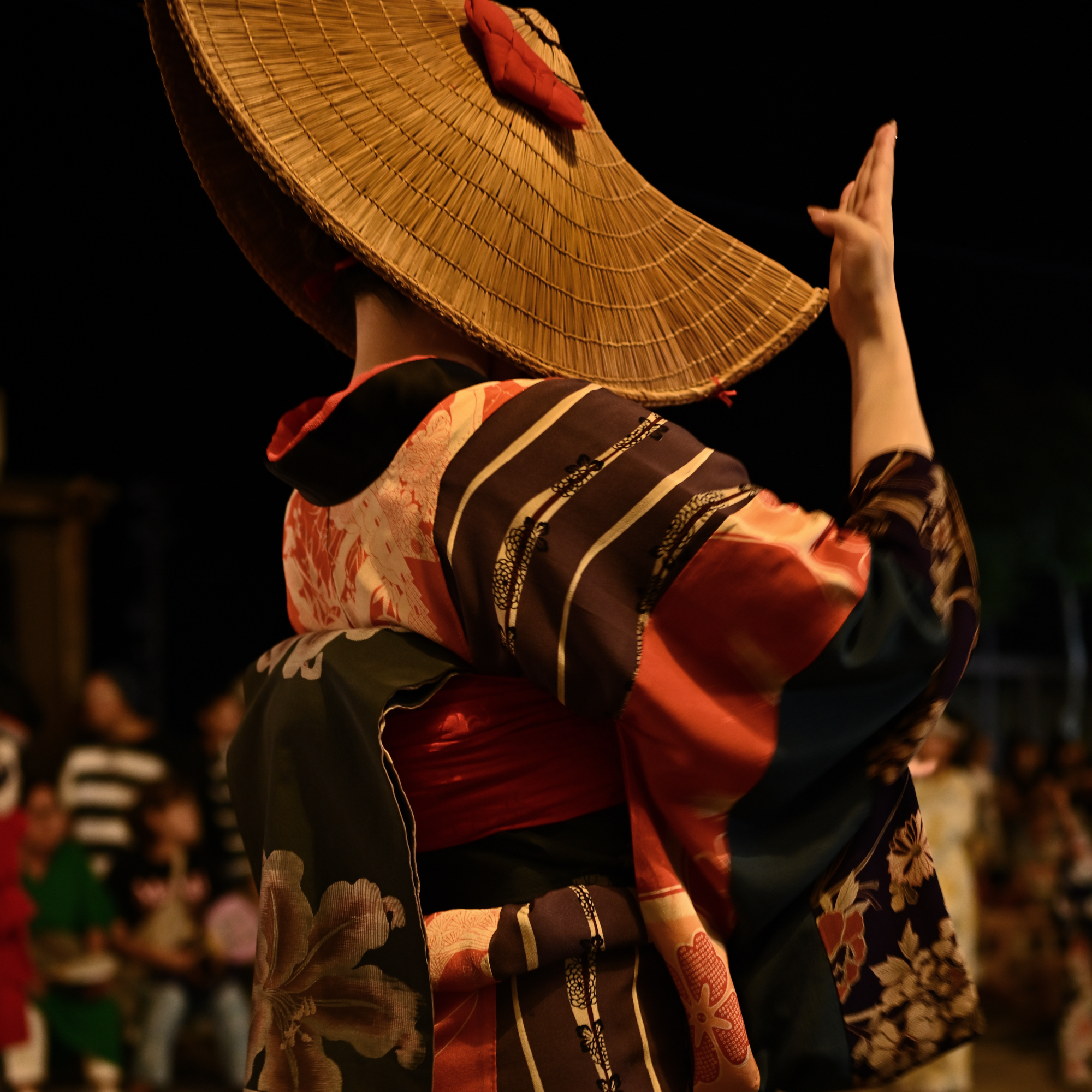 篝火に照らされて、目深に編み笠をかぶって美しい端縫い衣装をまとった踊り手たちが、盆踊り会場を舞めぐります。